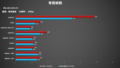 常规帧数测试结果如图所示,AMD锐龙79800X3D在这9款游戏中均有更出色的帧数表现,尤其是网络游戏,帧数差距很大。这是因为网游会频繁处理实时数据流,超大三级缓存意味着能存储更多常用数据,降价幅度较大从而提高缓存命中率,显著提升CPU数据访问效率,减少内存延迟,从而让游戏可以稳定维持高帧率。而且也能看出来3A游戏虽然没有网游那么吃缓存,但大缓存因为能更频繁加载纹理、模型等游戏资源,所以依旧能在3A游戏中获得更好帧数表现。即使英特尔酷睿Ultra9285K的性能核拥有更高的频率,也无法撼动AMD锐龙79800X3D的游戏成绩。